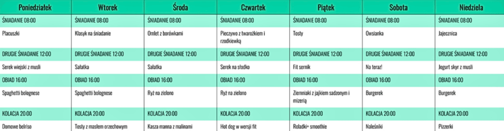 - Tabelę, którą możesz wydrukować i umieścić na lodówce – zawiera ona wszystkie posiłki wraz z podsumowaniem dnia (kalorycznością, makroskładnikami itp.).